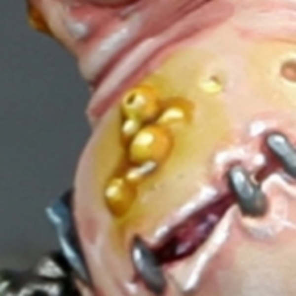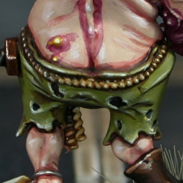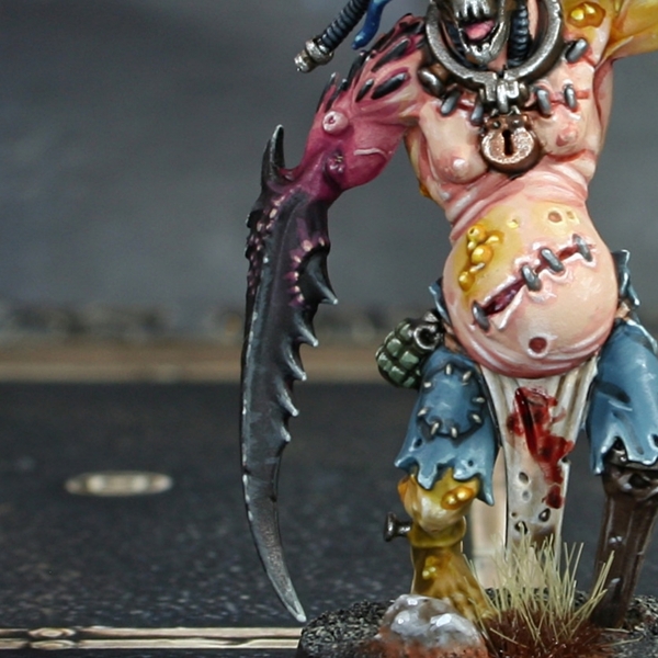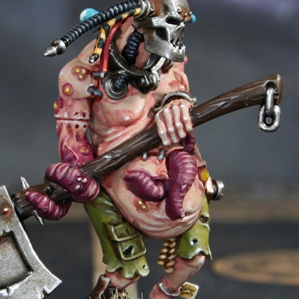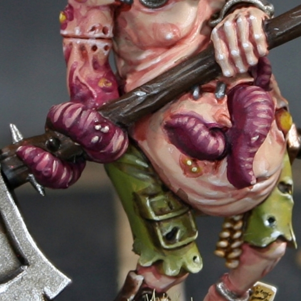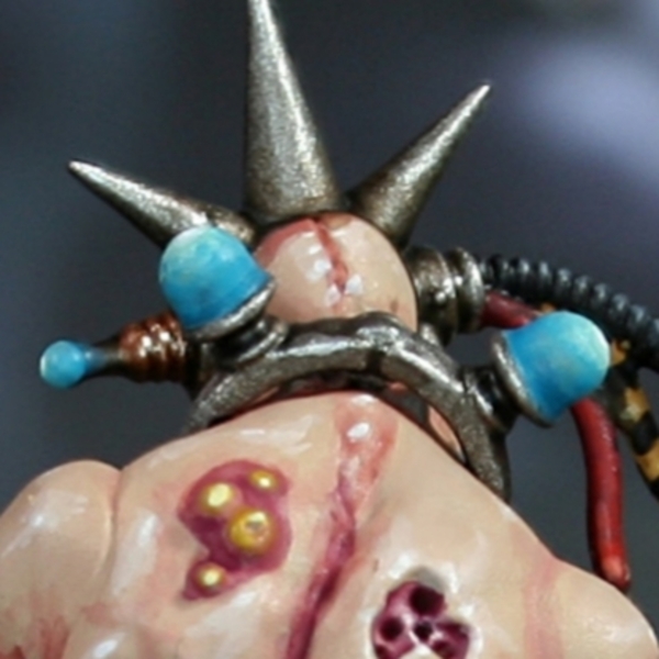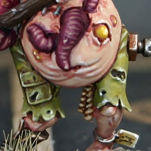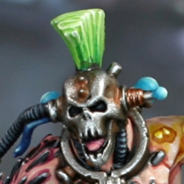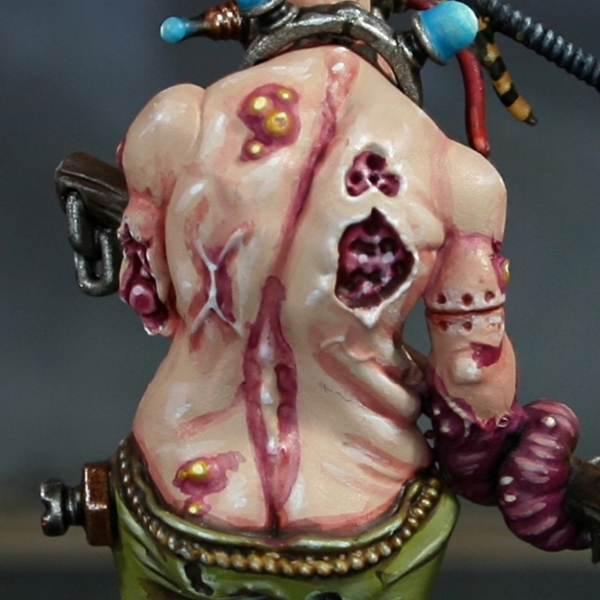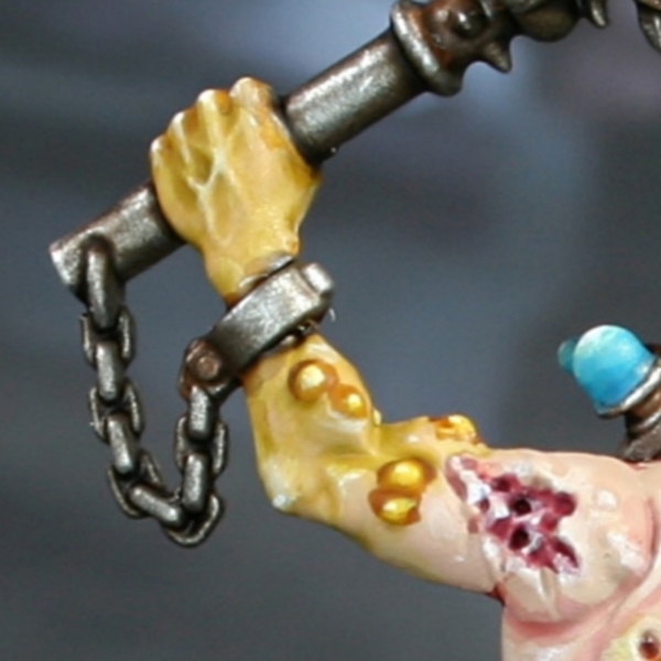 For boils within these diseased patches, I just picked out the highest points with Flash Gitz Yellow , then finished with a smaller, specular highlight of Ice Yellow .