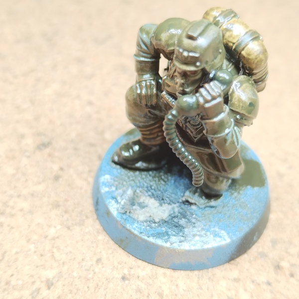 With an old brush cover all the mini with Streaking Grime if you want something less heavy you can dilute a little mineral spirit (white spirit). After waiting for the paint to stop shining, this can take 30 min to 3 h depending on the temperature.