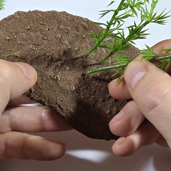 Put a small dot of glue on the bottom of the bamboo stalks. Insert them into the holes, then hold them steady long enough for them to stay put.If you wanted to go the extra mile, now would be a good time to stain the bottom of the stalks. Applying a few tufts of a little static grass may be good too.