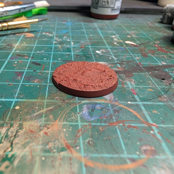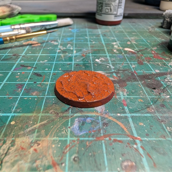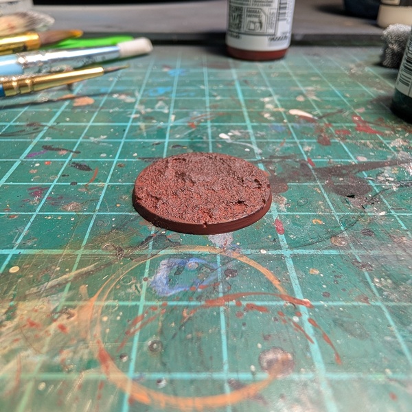 Optionally, dry brush with Dark Rust . It's mostly useful for larger rocks rather than small textures though. I wouldn't buy a specific paint for this; any black or dark grey you own would work equally well.