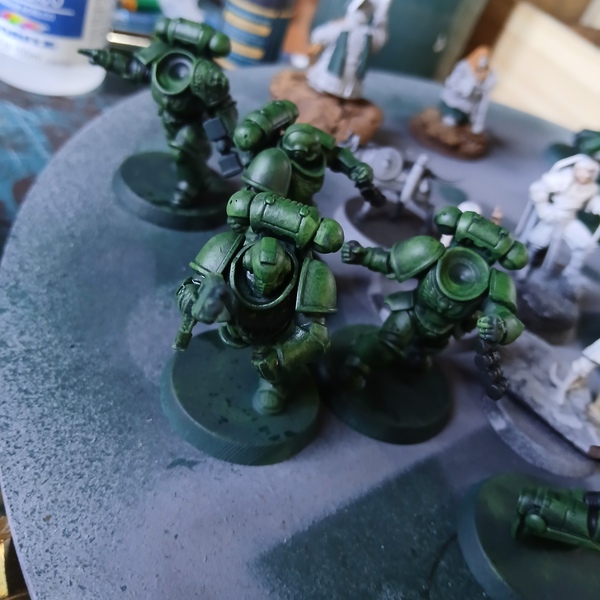 Apos seca a base e o dry brush, passei para apintura daa articulacões com a cor Preto Fosco(acrilex) e após, apliquei o wash verde da Arsenal Craft, sobre a armadura.