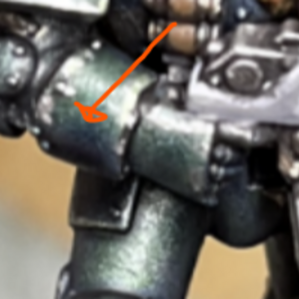 - The next section is completely optional, but some areas look a bit flat without some extra detailing. So I use watered down Gunmetal for highlights, and Black Templar for shadows. Then using a little water on the brush you can drag the paint to create transitions. The main area I hit is on the rounded vambraces.